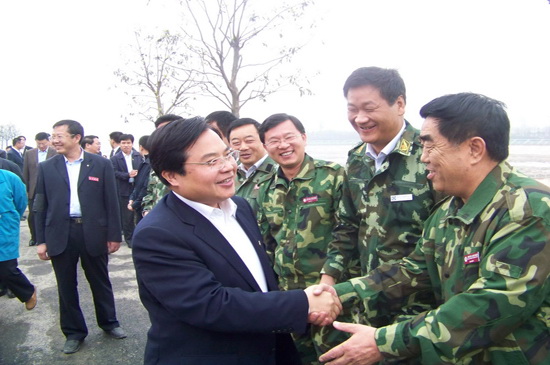 4月10日上午,山東省黨政代表團(tuán)在省委書(shū)記姜異康、省長(zhǎng)姜大明率領(lǐng)下,到北川新縣城檢查指導(dǎo)援建工作,山東省十七地市黨政負(fù)責(zé)人參加檢查。徐鵬強(qiáng)董事長(zhǎng)在集團(tuán)公司援建的安昌河堤頂?shù)缆飞嫌訖z查團(tuán)并陪同檢查。