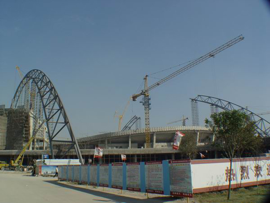 上圖為適時(shí)施工中的奧體中心體育場(chǎng)工程