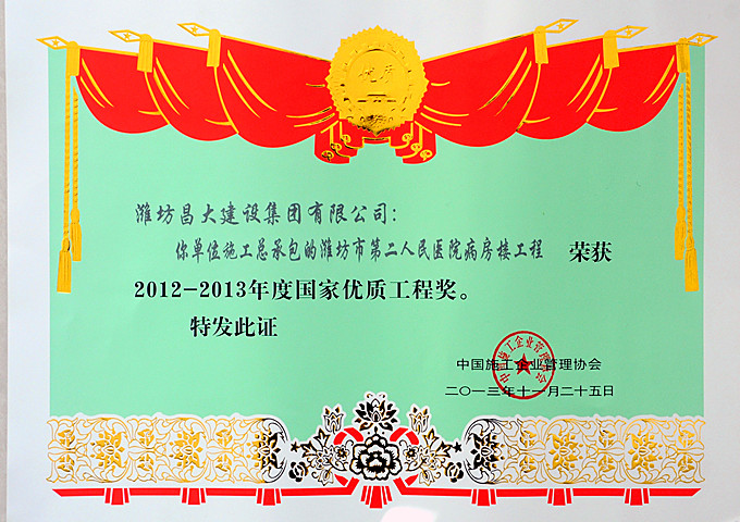 2013年12月27日,中國施工企業(yè)管理協(xié)會在北京召開“2012-2013年度國家優(yōu)質(zhì)工程獎”表彰大會,為獲獎?wù)哳C獎。由集團(tuán)第一分公司施工的濰坊市第二人民醫(yī)院病房樓工程獲此殊榮。 國家優(yōu)質(zhì)工程獎是我國工程建設(shè)質(zhì)量方面跨行業(yè)、跨專業(yè)的國家級榮譽(yù)獎勵(lì),已經(jīng)成為政府提倡、社會知名、企業(yè)向往、專家認(rèn)可、實(shí)踐過硬的著名品牌,以其權(quán)威性、規(guī)范性、指導(dǎo)性、示范性在工程建設(shè)領(lǐng)域享有崇高的聲譽(yù)。