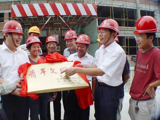 右二為項目經理徐順福 全國青年文明號——徐順福項目部今日舉行揭牌儀式 9月19日上午10時30分,為全國青年文明號——徐順福項目部舉行的揭牌儀式,在集團公司總部辦公樓前舉行。 揭牌儀式由市建設局副局長葛繼卿主持,山東省建設廳機關黨委常務副書記張普林,副書記金純龍,團委書記辛平,科長李學雷;共青團濰坊市委副書記李強;濰坊市建設局黨委副書記高峰;集團公司總經理、黨委副書記朱九洲,黨委副書記丁守起,監(jiān)事會主席、紀委書記滕忠斌等出席了揭牌儀式。 在今天的揭牌儀式上,由辛平宣讀住宅和城鄉(xiāng)建設部、共青團中央的命名決定,全國青年文明號——徐順福項目部負責人徐順福做表態(tài)發(fā)言,高峰和張普林分別代表市建設局和省建設廳做了重要講話。 集團公司總部人員,部分基層單位、子公司的代表,各基層單位團組織代表,市建設局系統(tǒng)各單位團組織負責人共200余人參加揭牌儀式。 濰坊電視臺、濰坊日報社、濰坊人民廣播電臺、山東商報等多家媒體記者現(xiàn)場采集新聞。 榮獲全國青年文明號這一榮譽,這在集團公司的歷史上還是第一次。