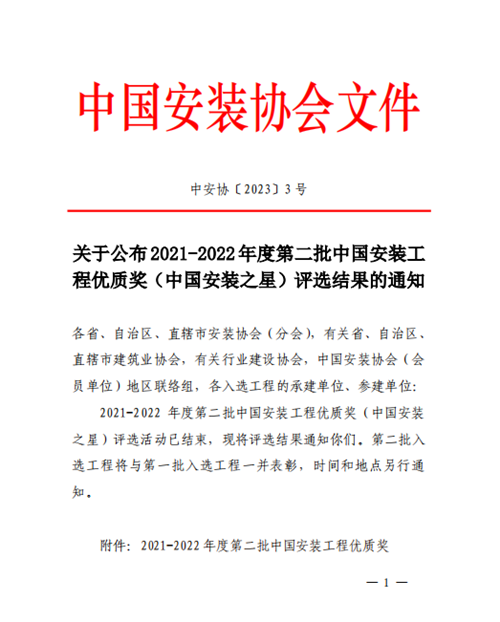 集團(tuán)公司再創(chuàng)一個國家級安裝工程質(zhì)量最高獎——安裝之星