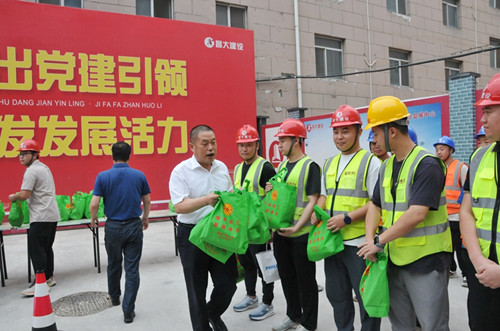 2023年7月12日上午,濰坊市總工會(huì)副主席朱建平到集團(tuán)總承包施工的市重點(diǎn)項(xiàng)目濰坊市人民醫(yī)院項(xiàng)目現(xiàn)場進(jìn)行了“情系職工?夏送清涼”走訪慰問活動(dòng),向廣大一線建設(shè)者表示慰問,并為一建公司、四建公司一線職工發(fā)放清涼物資包(天堂折疊傘、日照綠茶、六神花露水、奇強(qiáng)洗衣粉、舒蕾沐浴露、潔玉毛巾等)。