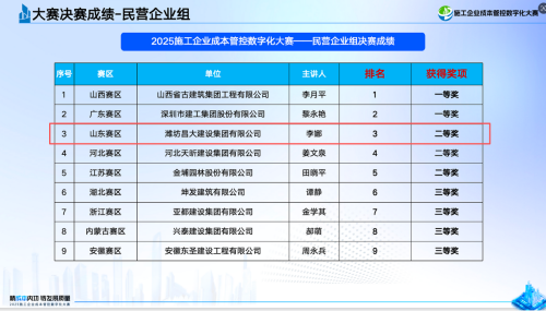 近日,備受建筑行業(yè)關注的“2025施工企業(yè)成本管控數(shù)字化大賽總決賽暨頒獎典禮”在北京圓滿落幕。集團公司憑借扎實的成本數(shù)字化實踐成果,從全國近三千家參賽企業(yè)中脫穎而出,最終斬獲民營企業(yè)整體排名第三、民營企業(yè)組二等獎的優(yōu)異成績。